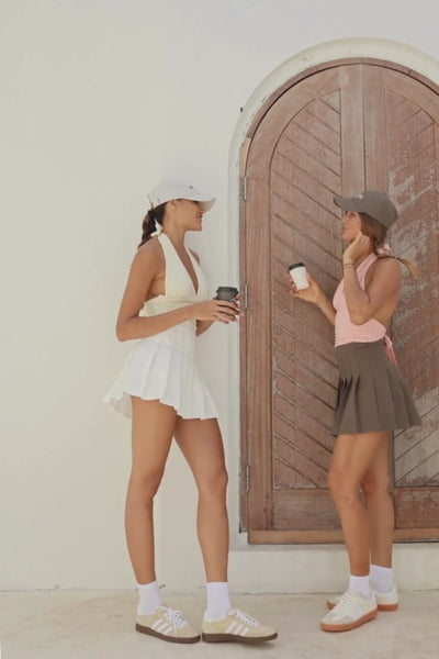 Introducing the Aby Top in Pink Peach Fuzz, your new everyday essential. Crafted from our signature soft cotton blend that shows off your figure perfectly. This halter top features a deep V-neckline, flattering ruched details, and chic ties at both the front and waist. Style it with tailored pants for office-ready polish or pair with your favorite jeans for a more laid-back vibe. With sizes ranging from XS to XL, this versatile piece is the perfect building block for your everyday bodycon wardrobe!